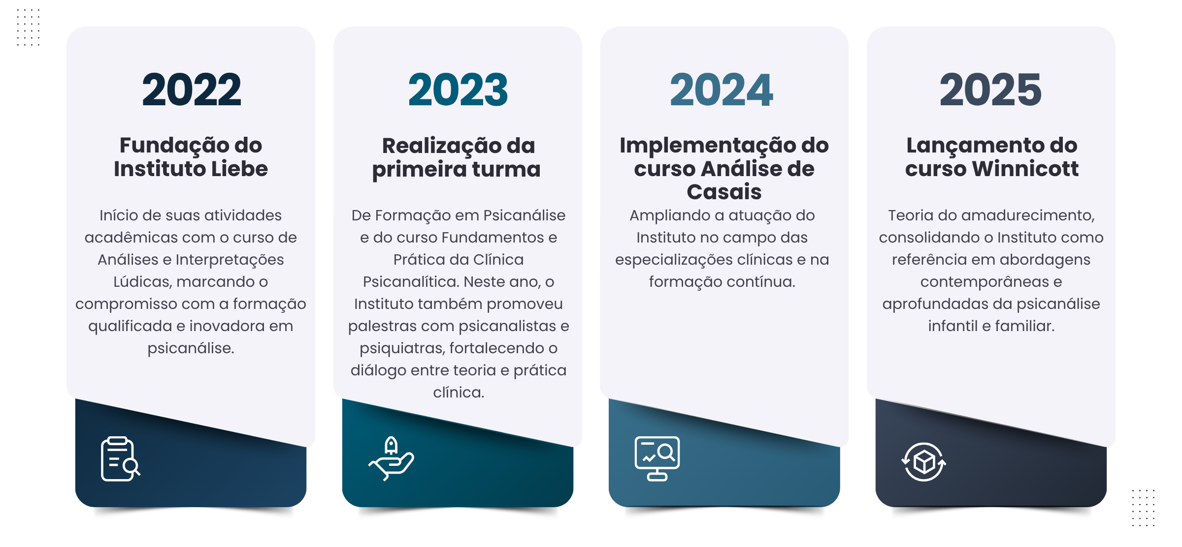 Desde 2022, o Instituto Liebe trilha uma jornada dedicada à formação psicanalítica de excelência. Ao longo dos anos, consolidou-se como referência em inovação e aprofundamento teórico, ampliando suas especializações e fortalecendo o diálogo entre teoria e prática clínica. Cada curso e projeto reflete o compromisso do Instituto com a construção de conhecimento e o desenvolvimento humano através da psicanálise.